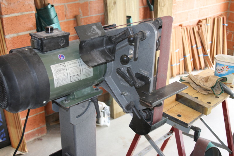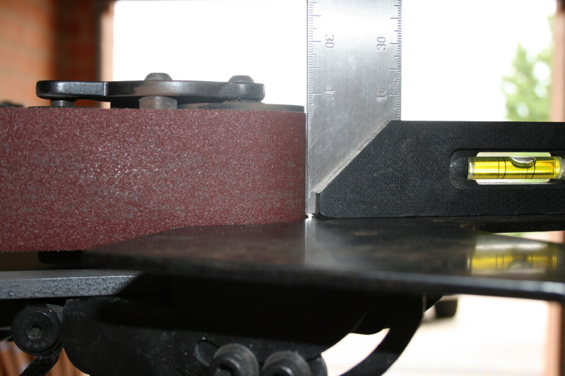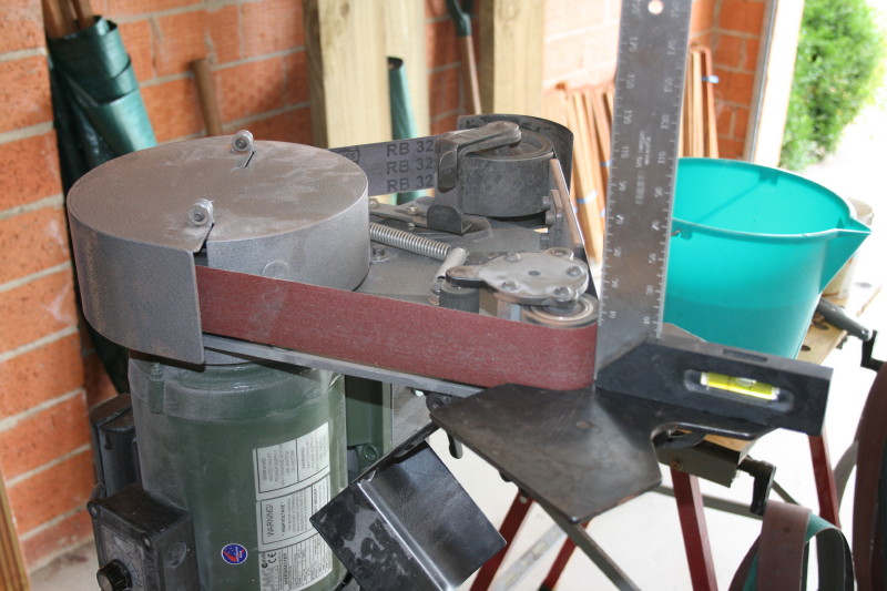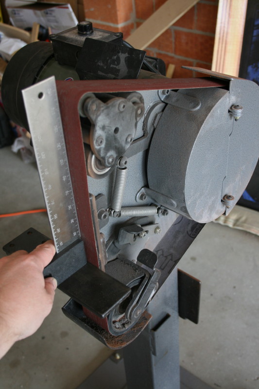 Here I am checking to make sure the work rest is 90 degrees to the platen before I grind the outlines down and the tabs off. The RadiusMaster has the platen, 3 wheels up the top, a 4" wheel down the bottom and the big 8" wheels all usable. I'll be using a P100 belt that was handy for doing the profiling.