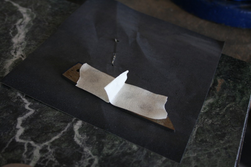 After any type of profile grinding like this or drilling any holes you will create a little burr that needs to be sanded off. I use a little tab of masking tape to make a little handle to flat sand them on my granite flat (which is actually a granite chopping board). I used P120 to start with on the blade to get rid of the mill scale and P240 on the liners and back spacer. I found that the titanium sands really easily.