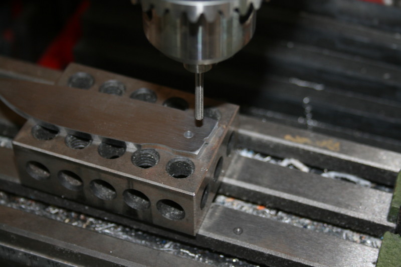 I then use a drill bit to line up the centre point on the spine of the blade. I then lock the x axis on the mill in place.