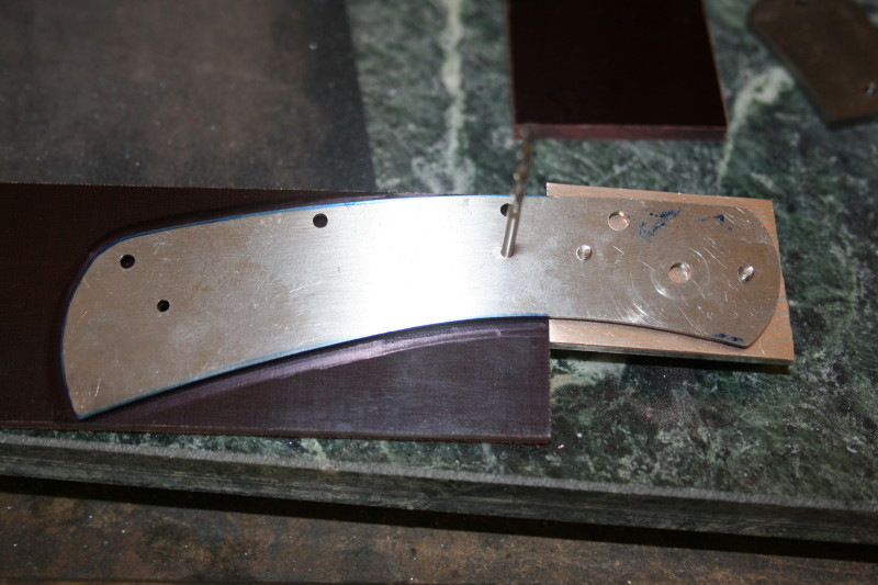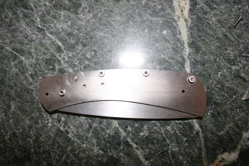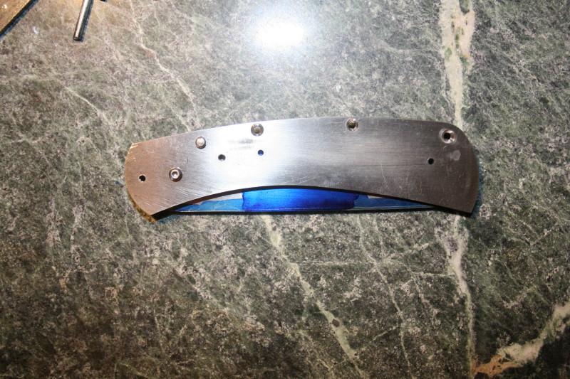 Here is is before I counter sunk the holes in the liner without the lock. This is where my first gotcha came up. Using a 2-56 counter suck screw there is no a lot of room between the edge of the liner and the screw head. I left about 1/32 between the edge and where the counter sunk starts and I haven't touched the profile of the liners yet I only ground the tabs off. Hopefully I have left enough space so I don't hit the counter sunk holes.