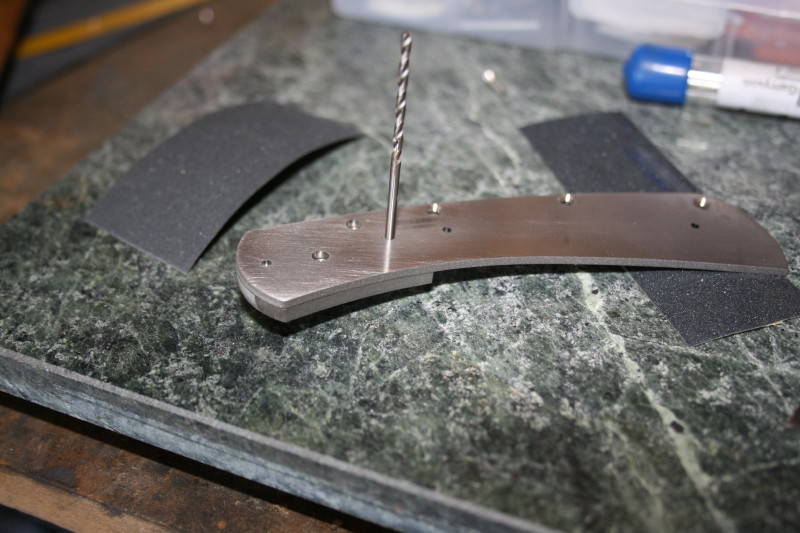 So now you can see the addition of a lanyard hole in the back of the knife. That meant drilling a bunch more holes and tapping another screw hole.