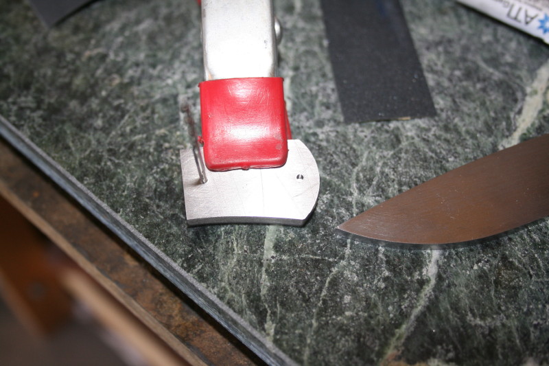 Next up is grinding the blade. I have been trying out a jig that was in Chris Crawford's slipjoint DVD. I have marked the edge of my blade with some layout dye and used a drill bit to put the centre line on my blade.