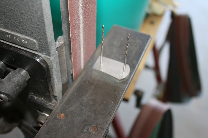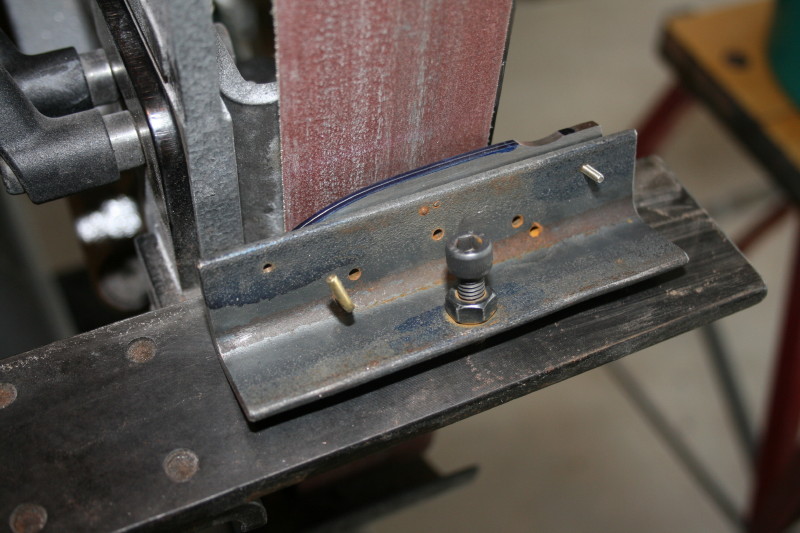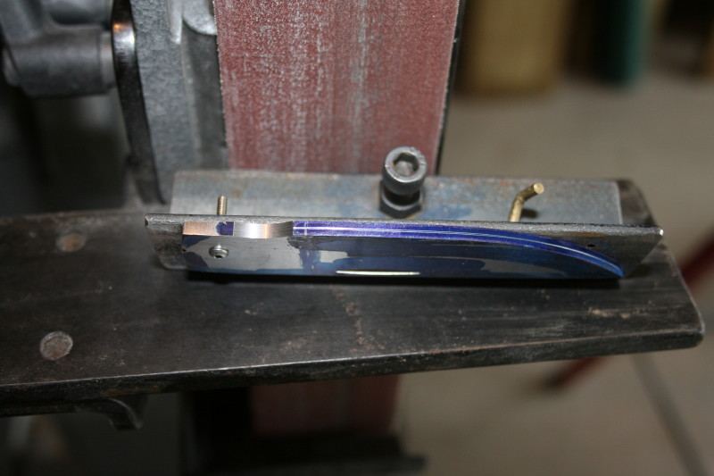 Just about to start grinding. The angle of the jig can be adjusted by screwing the screw in and out. Once the first side is done you can lock the screw in place and then just grind the second side. The little brass bit is to support the blade while I grind it. you can drill different holes depending on the blade shape and length.