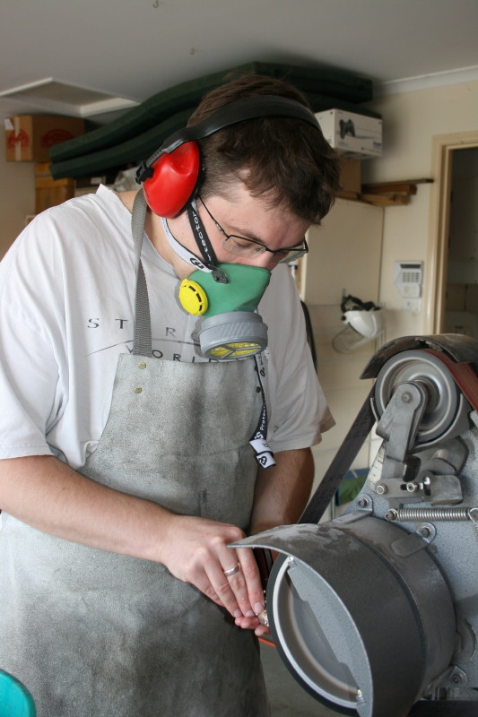 This is my grinder. It is a variable speed RadiusMaster made here in Australia. A very expensive piece of kit but excellent for making folders especially if you have limited space. I have mine on a board with wheels so it can be moved into position under the light when needed and pack away when I am finished so the car can go back in the garage.