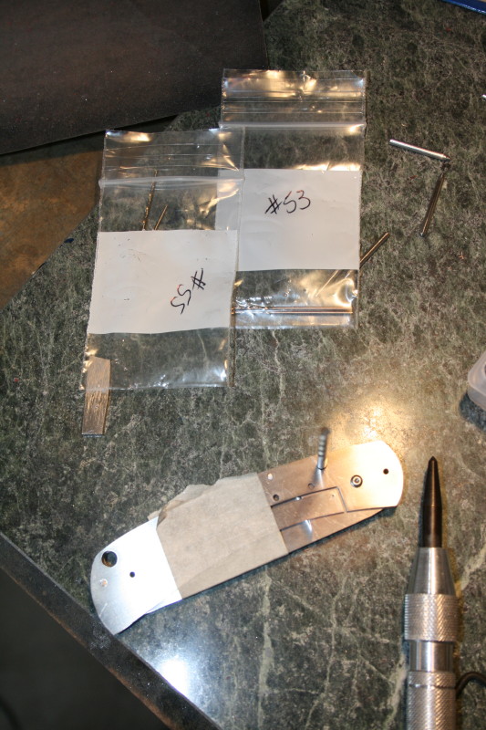 The process I did was this though. On the lock side liner I drilled all the holes with a #49 drill bit deburring as I went when necessary. I then aligned the liners with the pivot pin in one end and clamped them together so I could drill through the lock side liner into my other liner. After the first hole was drilled I used a spare #49 drill bit as a second alignment pin and then went and drilled the rest of the holes. Once that was done I aligned the back spacer with the edge of the liner and drilled my first hole in that. I pinned it with the drill bit again and drilled the second hole. I put another spare drill in that hole and drilled the final hole in the backspacer. Once they was done and everything was deburred I went back and drilled the 3 liner holes out with a #43 drill bit and went through the same pinning and drill process on the back spacer. Now I could tap the 3 liner holes for the lock side liner as well.