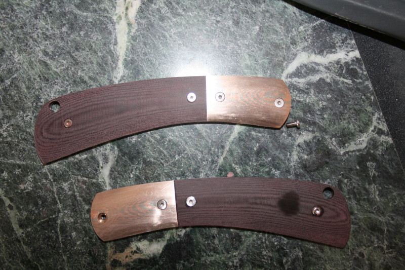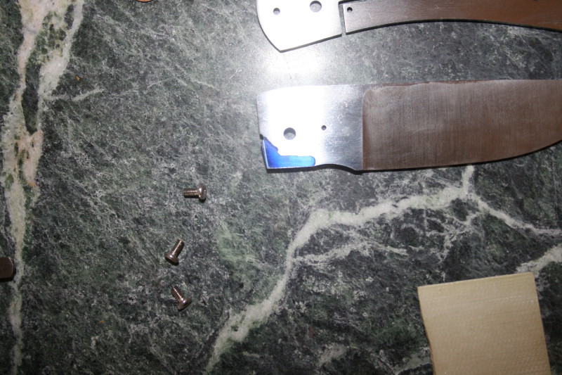 I found out that there is a local knife maker that has an anodizer I can use so this has changed my mind a little on what I am going to do. I had a piece of mokume laying around from an older project that I never used it on. I think now might be a good time to use it so I spent the first part of the day matching the holes in the existing bolsters and fitting up the new mokume bolsters.