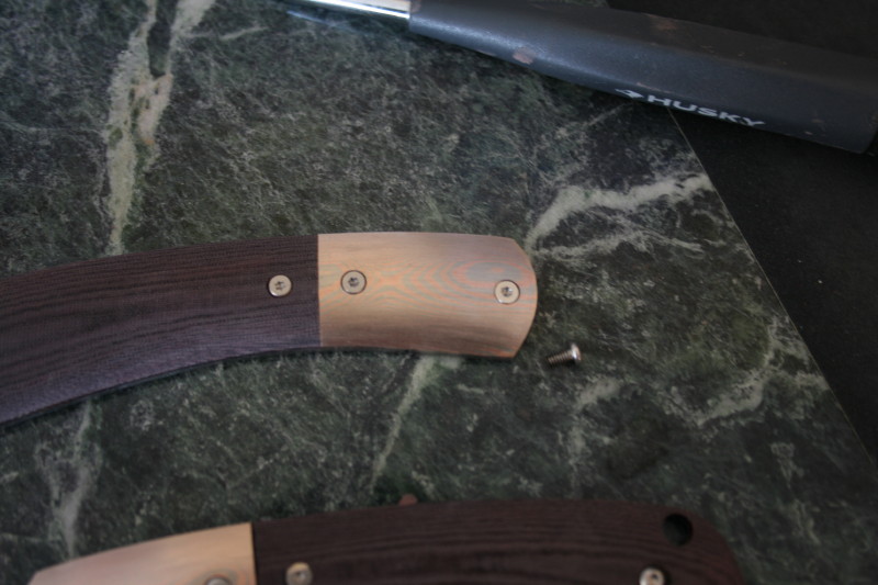 After that I assembled the knife again and ground back the extra thread on the 3 back spacer screws and I also ground down the heads of the screws so they were flat. This is a bit of a worry since there is not a lot of the torx head left once the head is ground down. I stripped the driver inside one screw already luckily we have spares.