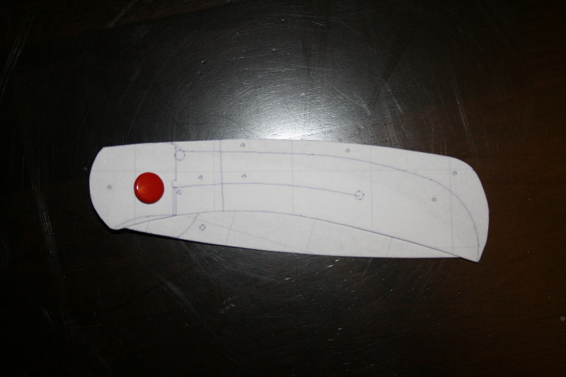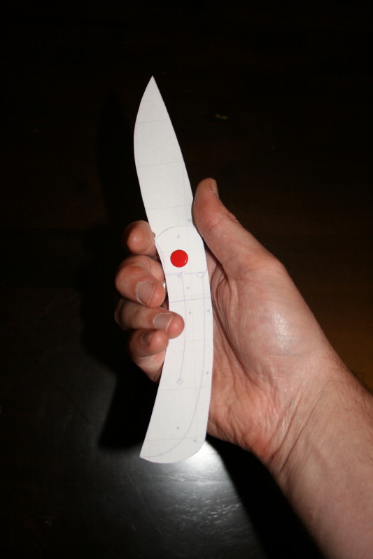 I was going to ask David if he has a pic of the build off knife in a closed position to see what it would look like but then I thought I can use the power of my (not quite a water jet) ink jet printer to print out a copy. Then I can see how things will all line up and how it will look in the hand as well as closed. So here are some pics.
