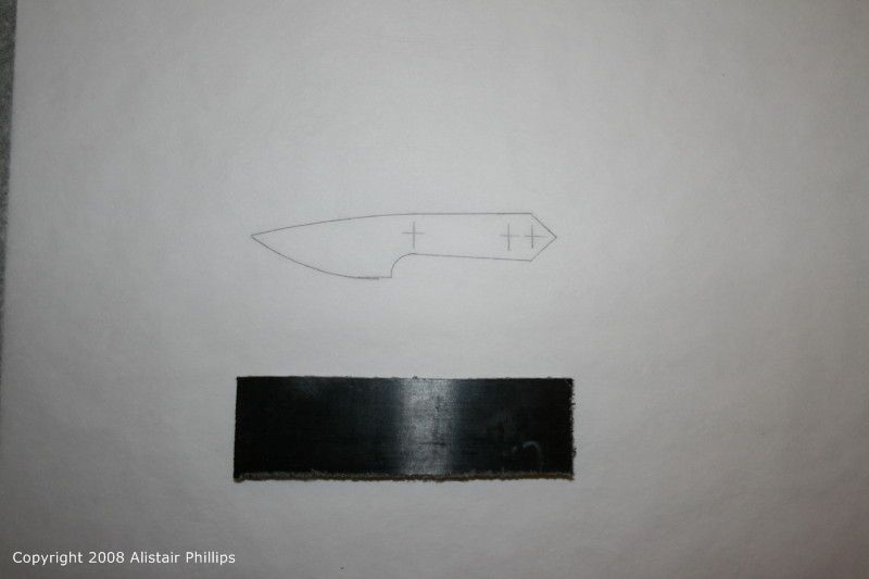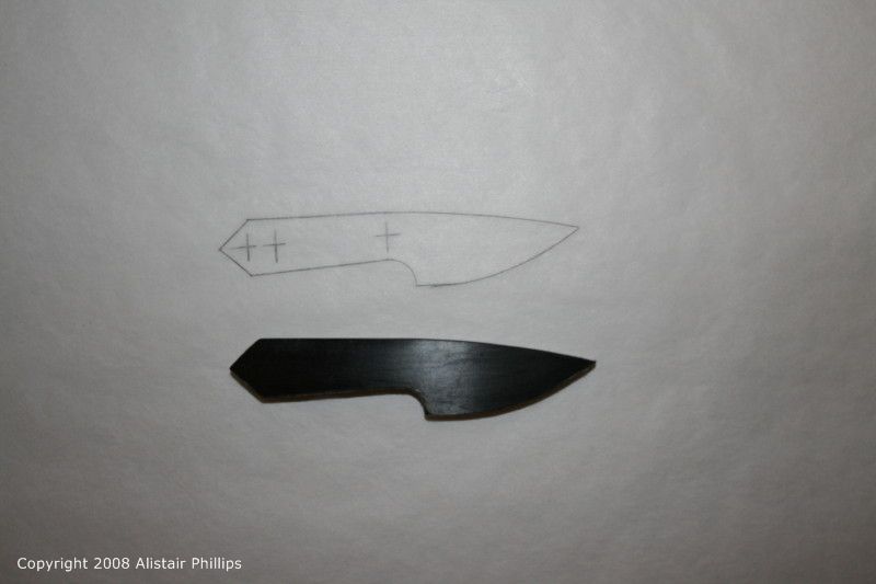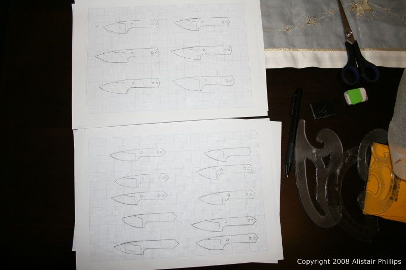 The first picture shows just how many designs I went through to get something I felt was small enough, had the right handle to blade proportions. The designs on the top page I decided were all to big and I wanted something smaller. I was trying to restrain the designs to within a box no longer than 3 inches the reason being I wanted to be able to get 2 knives out of one bit of 3 x 1 1/2 inch piece of steel. It wasn't until I stopped trying to draw the knife within a box and I setup a few pictures with the middle of the tang as the starting point that I reached my ideal design. You can see a tick next to the final design. It was a little longer the 3 inches overall but I wanted a pointer tip so I was happy to compromise. After going through all those designs I think I will be doing some more sketchy drawing of my knives to get an overall idea before I start to refine the design on the graph paper.