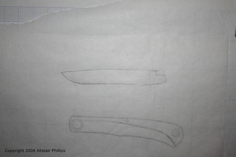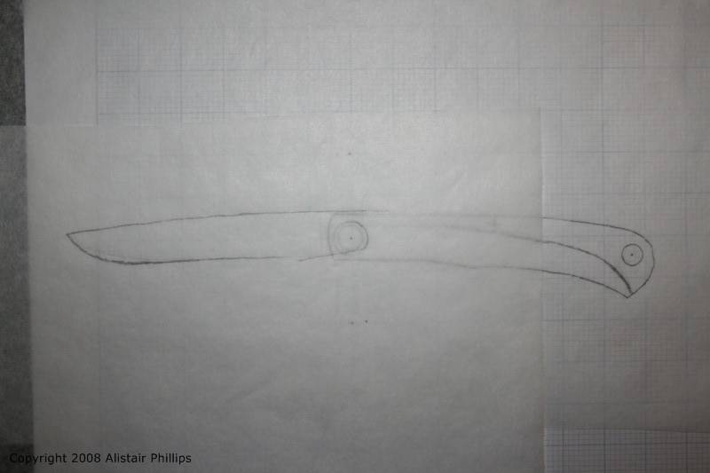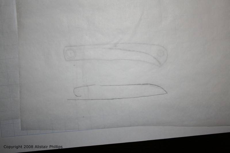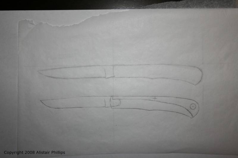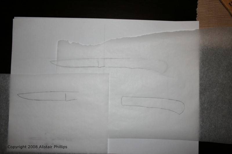 Now I align the blade underneath the handle tracing and trace the blade onto the drawing of the handle. This is the completed version of our knife. We could make several photocopies of it and trace them onto the steel ready to begin making this knife.