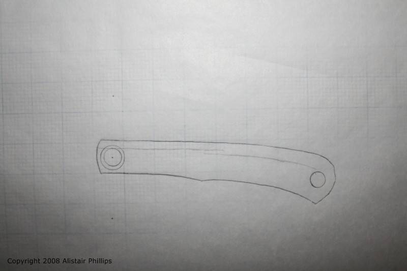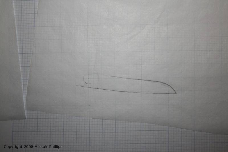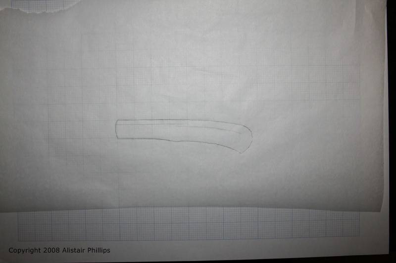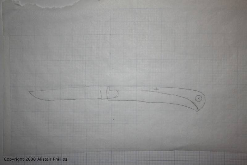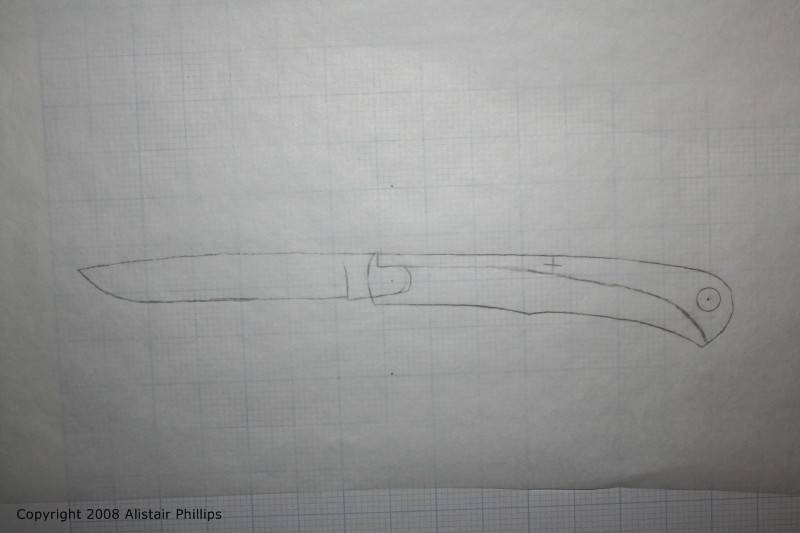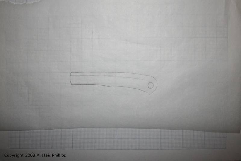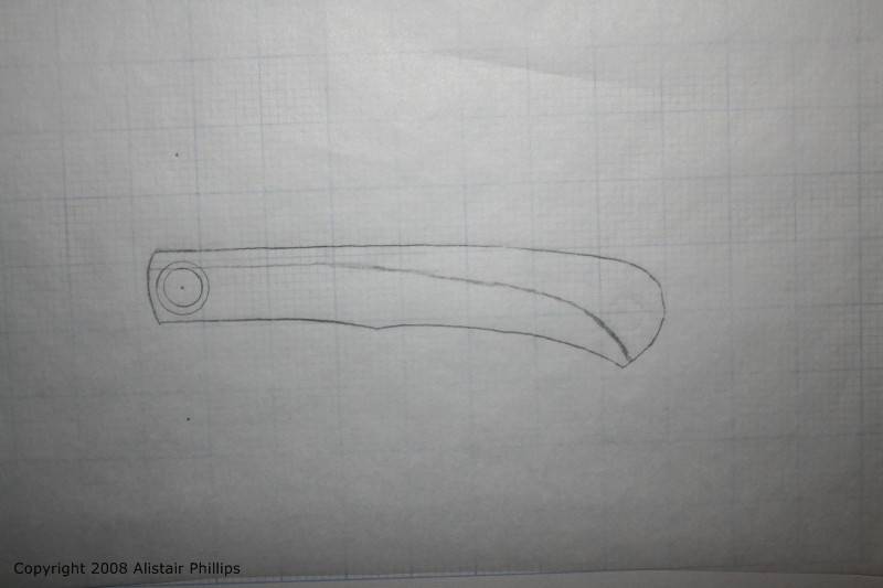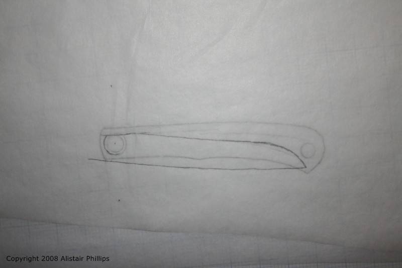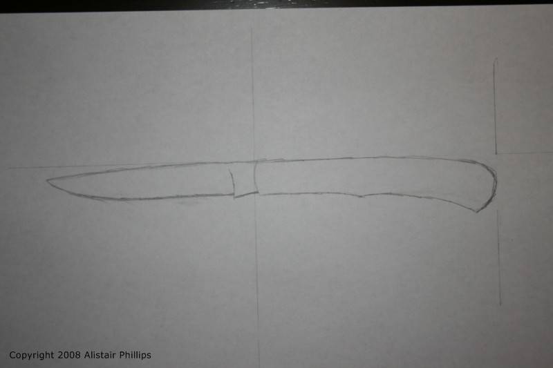 From my simple thumbnail idea I have sketched a full sized version of the knife with the aid of a few lines for dimensions. I would really recommend not using graph paper to it do this on. The idea at this stage is to get a feel for the flow of the knife and to let your ideas come out freely. I find it hard to do this when all the grid lines are in the way.