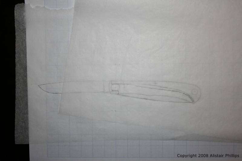 From my sketch I move to tracing paper. It would probably be a bit better to use something a little thicker but tracing paper was all I had at hand. I make 2 seperate tracings at this point one of the handle and one of the blade outline. It may be better not to draw the kicker onto the blade at this stage but instead to extend the blade further along as we will be adjusting the kicker location later on. I have also traced the blade further along the spine to help align things later when we are adjusting the open position of the blade.
